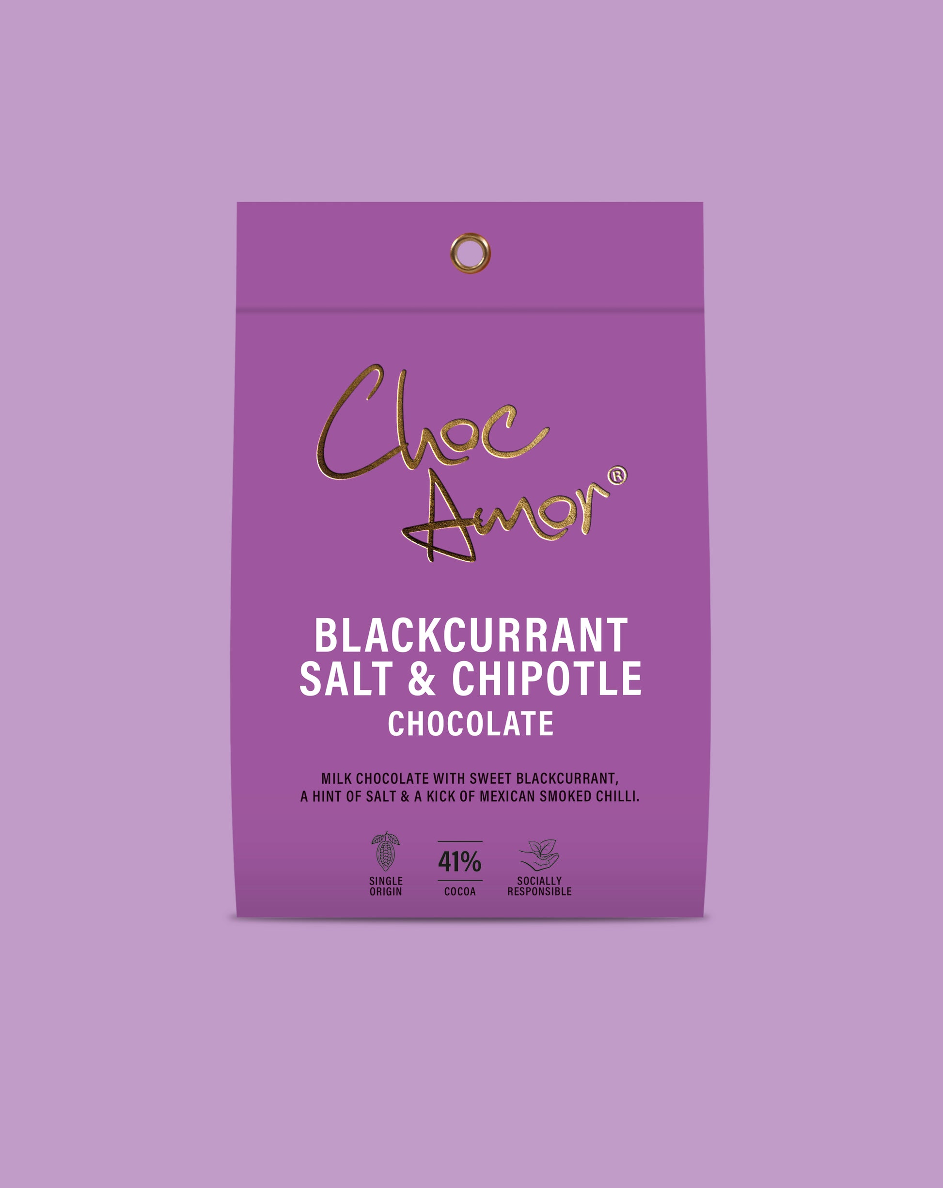 Milk Chocolate Flavoured with Chipotle Chilli Powder, Sea Salt, and Blackcurrant Flavouring.